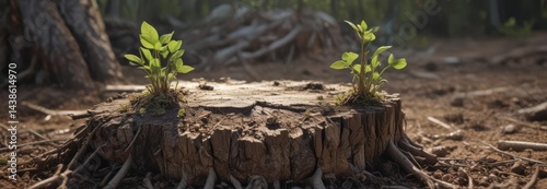 Obraz premium Tiny sapling sprouts from decaying, weathered stump , botany, image