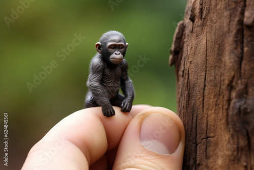 Obraz premium tiny small monkey sitting on a finger tip, ai generated