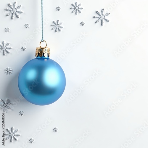 © Katherina, Fototapeta premium Tiny snowflakes scattered on a white background with a single blue bauble hanging from it, white, blue, small details