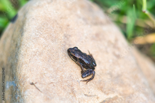Naklejka premium Tiny toad resting on a litle rock photo made outside in Weert the Netherlands