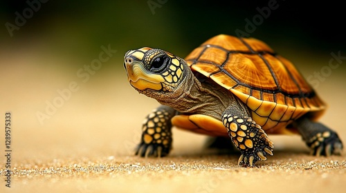 © muhammad, Obraz premium Tiny Turtle Crawls on Sandy Beach; Blurred Foliage Background