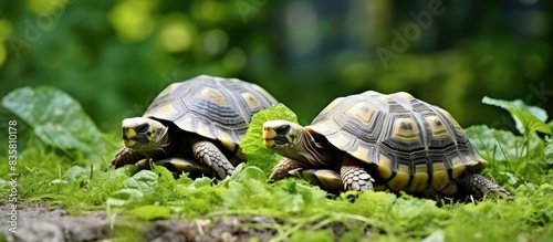 Obraz premium Tiny turtles munching on lettuce on the floor with copy space image available.