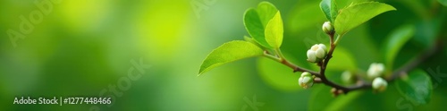 Fototapeta premium Tiny white buds peeking from tree's lush canopy, twig, leaves, bud