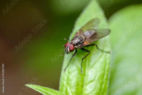 © christopher, Naklejka premium Tiny Wonders: Macro Shot of a Fly Resting on a Lush Green Leaf