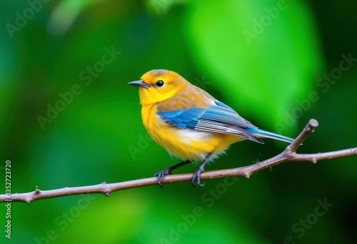 © ฉัน ก็คง, Fototapeta premium Tiny yellow bird, blue wings, perched on branch, bird, garden