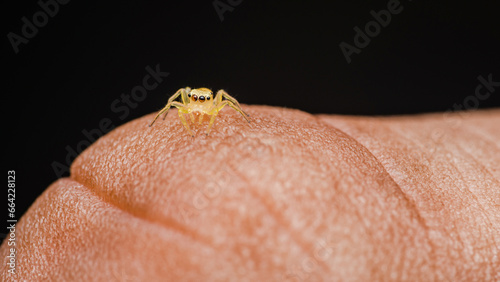 Obraz premium Tiny yellow jumping spider on finger of human, Macro photo of insect, Selective focus.