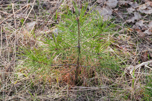 Obraz premium Tiny young pine among the withered grass in forest