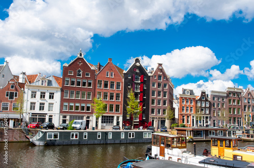 Naklejka premium Tipical Amsterdam cityscape with apartment houses in down town. The Kingdom of the Netherlands.