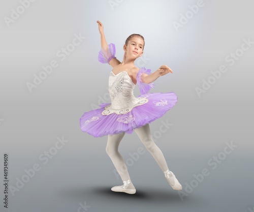 Naklejka premium Tips on toes. Young graceful ballerina dancing alone on background.