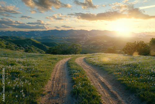 © Nakorn, Fototapeta premium Tire tracks on dirt road leading to rolling hills sunset landscape nature photography scenic view