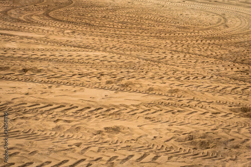 © Larysa, Naklejka premium Tire tread on the sand. Wet sand on the beach. Background for screensaver. Footprints in the sand. Sandy background. Leave traces. Unsteady road. Riding on a sandy surface.