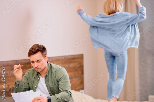 Fototapeta premium tired busy man sit on table working on laptop, checking documents while his wife jumping on bed, in casual wear