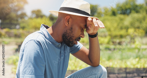 Obraz premium Tired farmer, man and outdoor on field with crops harvest, overworked or headache with fatigue. Agriculture, black person or summer heat wave on farm with plants conservation, agribusiness or burnout