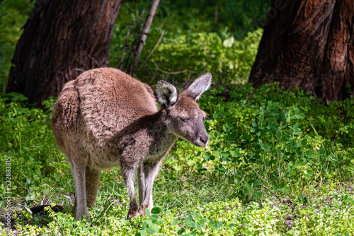 © Peter, Fototapeta premium tired kangaroo standing in front of green plants