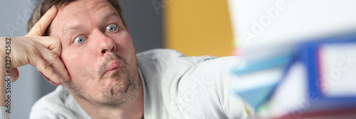 Obraz premium Tired man siting at table with many paper folders
