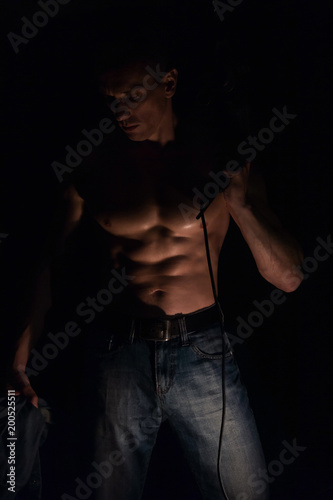Fototapeta premium Tired man with a drill, muscular man, the embodiment of masculinity