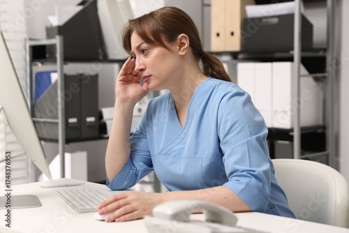 Obraz premium Tired nurse at desk in office. Medical worker