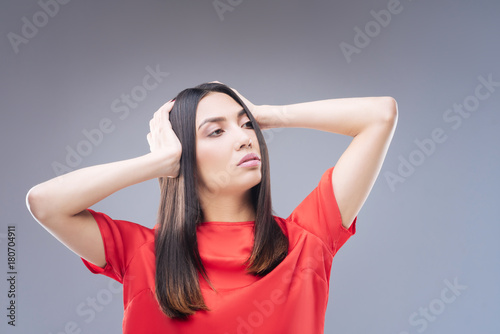Fototapeta premium Tired passenger. Exhausted young passenger touching her head after spending...