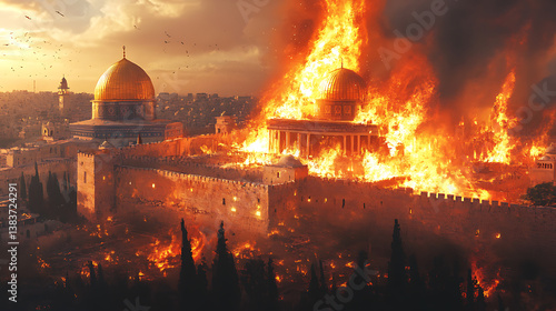 Fototapeta premium Tisha b’av, the destruction of the temple of jerusalem engulfed in flames,...