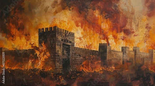 Naklejka premium Tisha B’Av. The destruction of the Temple of Jerusalem. The holy city of Jerusalem succumbs to fire and chaos as the Temple is razed. Digital illustration.