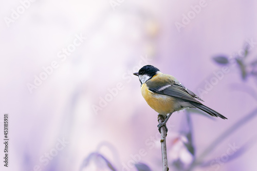 © julia_arda, Fototapeta premium Tit Bird Sitting On Branch on Fantasy Mysterious Spring Blurred Background, Fabulous Fairy Tale Floral Garden with Portrait Of Cute Little Songbird, Beautiful Artistic Image Toned in Violet Color.