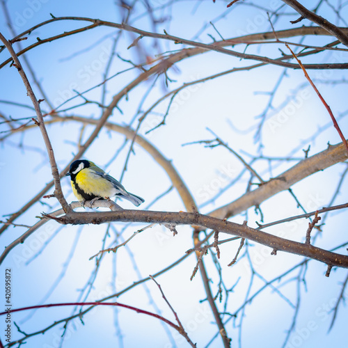 © Ilya, Fototapeta premium Tit on winter branches of an apple tree.