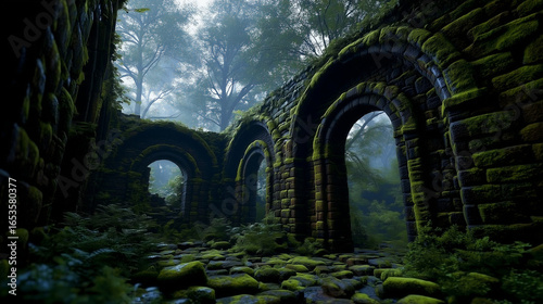 Obraz premium Title: Ancient castle ruins with moss-covered stone arches in forest