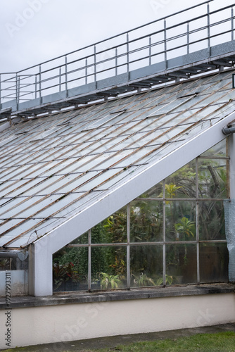 Fototapeta premium Title: Modern Greenhouse Roof with Glass Panels and Metal Structure
