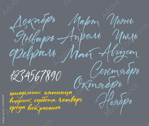 Fototapeta premium Title of months of the year. Numbers from 0 to 9. Days of the week