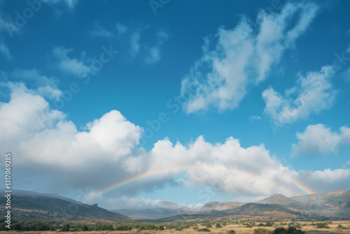 Obraz premium Title: Rainbow arch over clear blue sky with fluffy white clouds symbolizing...