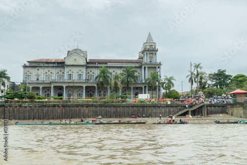 Naklejka premium Title Riverside view of Quibdó Malecon with Cathedral and riverboats