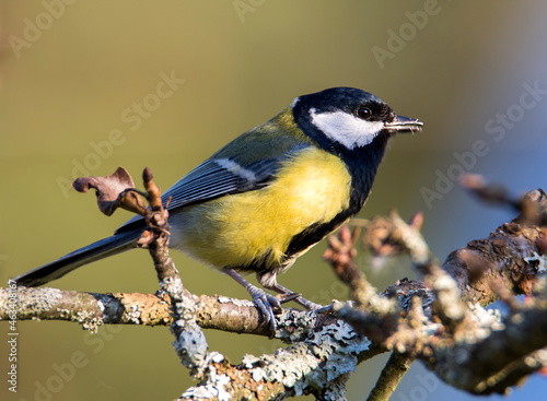 © galina_savina, Fototapeta premium Titmouse (Latin Parus major). The dorsal side is yellowish-green, the ventral side is yellow with a wide black stripe along the chest and belly.