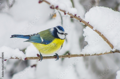 Fototapeta premium Titmouse sits on snow-covered branches in the park