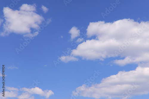 Fototapeta premium Tło błękitnego nieba z białymi chmurami w słoneczny dzień. Koncepcja natury. Poziomo, dużo miejsca na tekst.