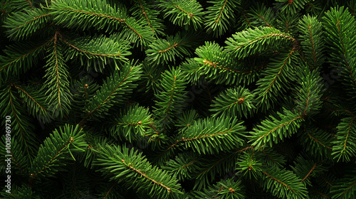 Obraz premium Tło składające się z gęstych gałęzi choinki, pokrytych soczystą zielenią, wprowadza świąteczny klimat.