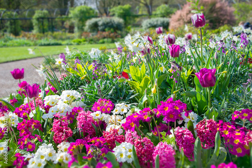 © Elena, Fototapeta premium Tło wiosna fioletowe zawilce, tulipany i primula flowerbad. Kwitnący wiosenny ogród