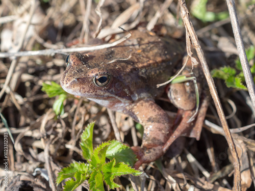 © Maslov Dmitry, Fototapeta premium toad among fallen dry leaves closeup