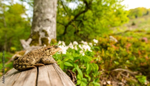 © Marifatul, Obraz premium Toad on log, forest backdrop