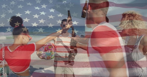 Fototapeta premium Toasting five friends raising beer bottles on sandy beach in swimwear with beach ball, flag overlay
