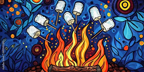 © jambulart, Obraz premium Toasting Marshmallows Over a Vibrant Fire