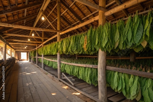 © Роман Заворотный, Fototapeta premium Tobacco Leaves Drying in a Rustic Barn Setting Generative AI