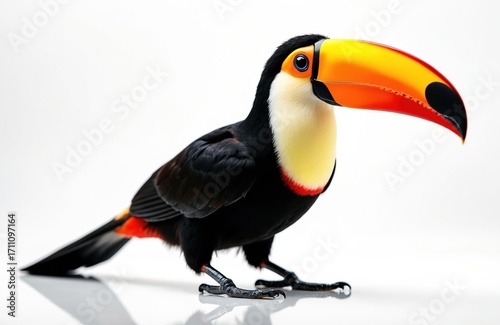 © Vadym, Naklejka premium Toco toucan bird with large colorful beak stands on white studio background. Exotic animal with black orange yellow plumage shows natural beauty for nature media.