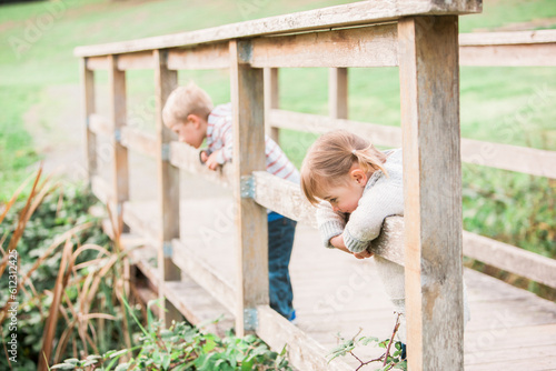 Obraz premium Toddler children leaning on footbridge railing in park