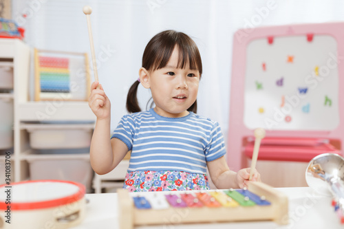 Fototapeta premium toddler girl play xylophone at home for homeschooling