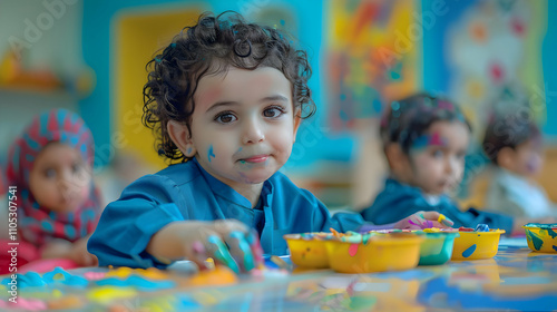Fototapeta premium Toddler joyfully paints, colorful fingers and face, preschool art class,...