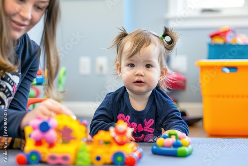 Fototapeta premium Toddler playing with colorful toys indoors during a sunny afternoon in a...