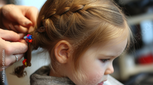 Fototapeta premium Toddler’s hair being gently braided with colored elastics at each end