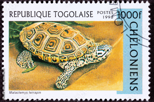 © qingwa, Obraz premium Togo Postage Stamp Spotted Diamondback Terrapin, Malaclemys Sand