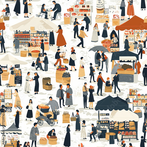Obraz premium Toile de jouy seamless pattern featuring market scenes vibrant marketplace digital art urban environment aerial view cultural heritage