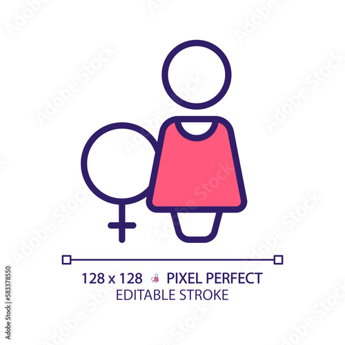 © IMG visuals icons, Obraz premium Toilet for women pixel perfect RGB color icon. Public restroom door marking. Closed space for ladies hygiene. WC service. Isolated vector illustration. Simple filled line drawing. Editable stroke